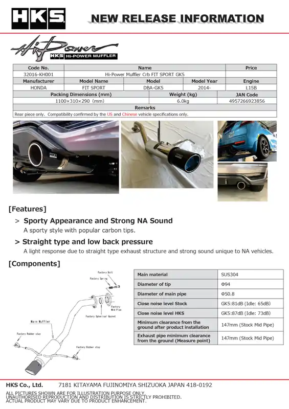 HKS Hi-Power Muffler 2014+ Honda Fit Sport GK5 w/ Carbon Tips