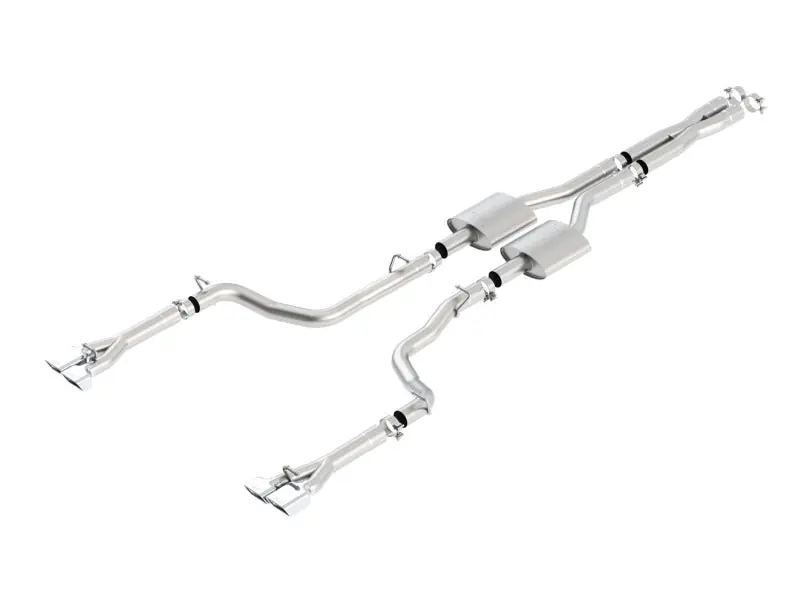 - This 2.75″ diameter Cat-Back(tm) system contains a Merge X-Pipe for increased performance while enhancing the aggressive ATAK(r) sound. The system delivers great sound with no drone inside the vehicle. The exhaust exits through dual 4″ x 2.5″ rectangle polished T-304 stainless steel tips on each side. BORLA(r) Cat-Back(tm) & Axle-Back multi-core technology is designed to unleash hidden horsepower. Increased exhaust velocity adds power, driving excitement, fuel economy, and the distinctive BORLA(r) Sound of Power respected by motoring enthusiasts everywhere. Each system is built from premium T-304 stainless steel, superior to T-400 series knockoffs (such as 409), to give you the absolute best in performance and durability. Ultra-smooth mandrel bends ensure maximum flow & power, and precision computer numerical control (CNC) manufacturing ensures an accurate fit. Best of all, BORLA(r) stands behind every system with a Million-Mile Warranty. Just what you’d expect from the world’s most experienced (and most winning) exhaust brand.