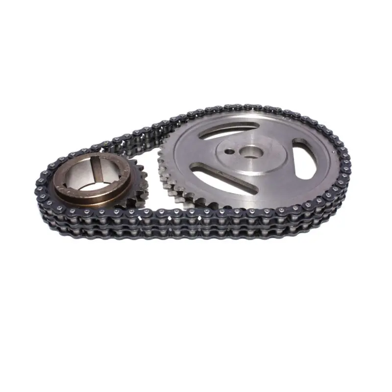 Feature induction hardened cast iron Camshaft Gear and billet Steel crank sprocket. 3 keyway crank sprocket for 4-degree incremental adjustability, 4-degree maximum advance/retard. Heavy-duty, heat-treated double row timing chain