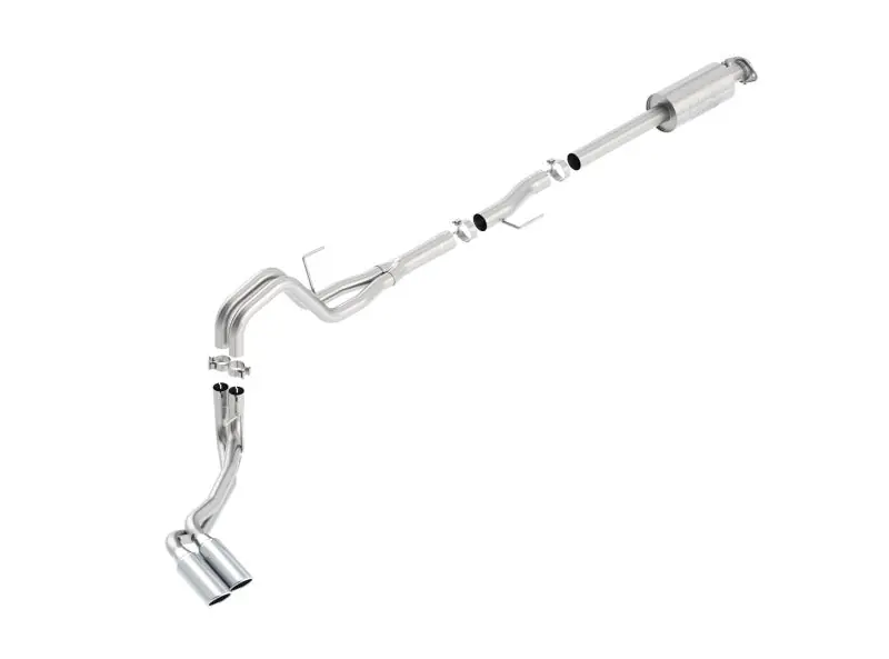 - EXCEPT Raptor. Add Adapter 60556 for Crew Cab with Standard Bed (6′ 7″) 156.8″ wheelbase, or Adapter 60564 for Ext. Cab with Long Bed (8′ 2″) 163.7″ wheelbase. This 3″ into dual 2.25″ system features the aggressive ATAK(r) sound with no drone inside the vehicle and exits through 4″ bright chrome on T-304 stainless steel tips. Borla(r) Cat-Back(tm) and Axle-Back multi-core technology is designed to unleash hidden horsepower. Increased exhaust velocity adds power, driving excitement, fuel economy, and the distinctive Borla(r) Sound of Power respected by motoring enthusiasts everywhere. Each system is built from premium, high-quality austenitic T-304 stainless steel, superior to T-400 series knockoffs (such as 409), to give you the absolute best in performance and durability. Ultra-smooth mandrel bends ensure maximum flow & power, and precision computer numerical control (CNC) manufacturing ensures an accurate fit. Best of all, Borla(r) stands behind every system with a Million-Mile Warranty. Just what you’d expect from the world’s most experienced (and most winning) exhaust brand.